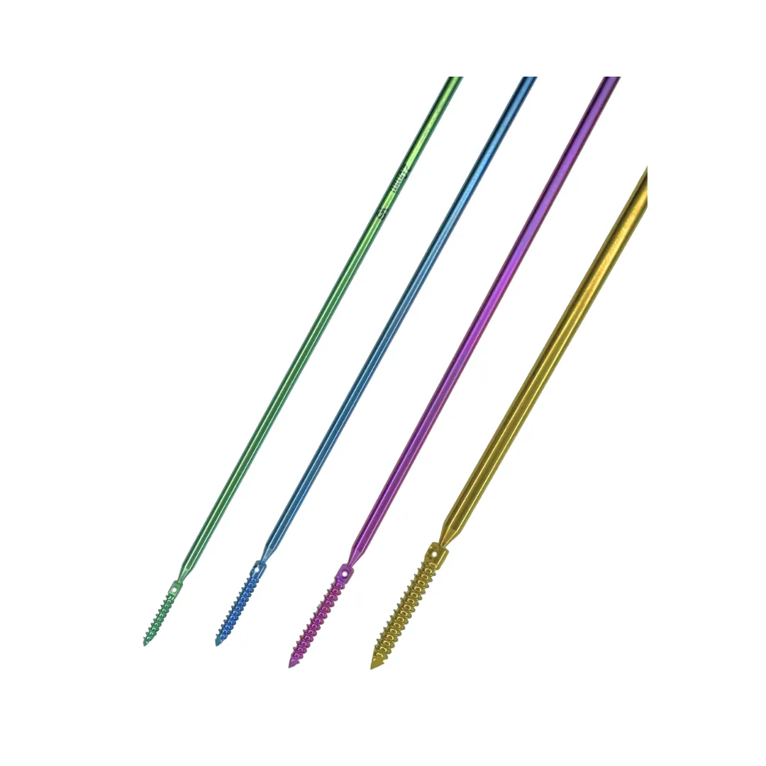 Anclaje de titanio TC4 anodizado para la fijación y reinserción de ligamentos en cirugía articular veterinaria.