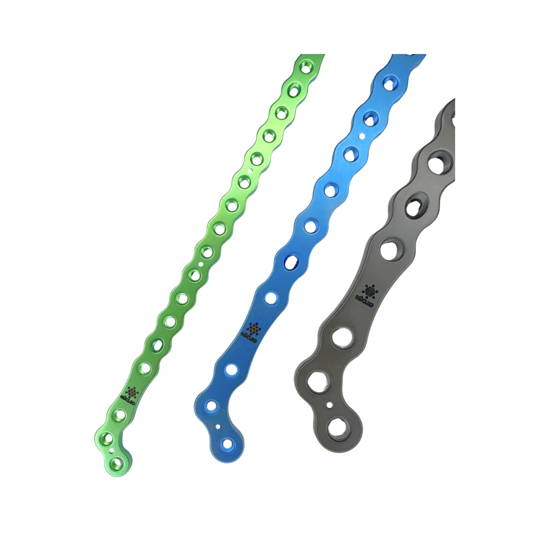 Placa de titanio TC4 anodizado con diseño en doble L para fracturas supracondilares y humerales distales.