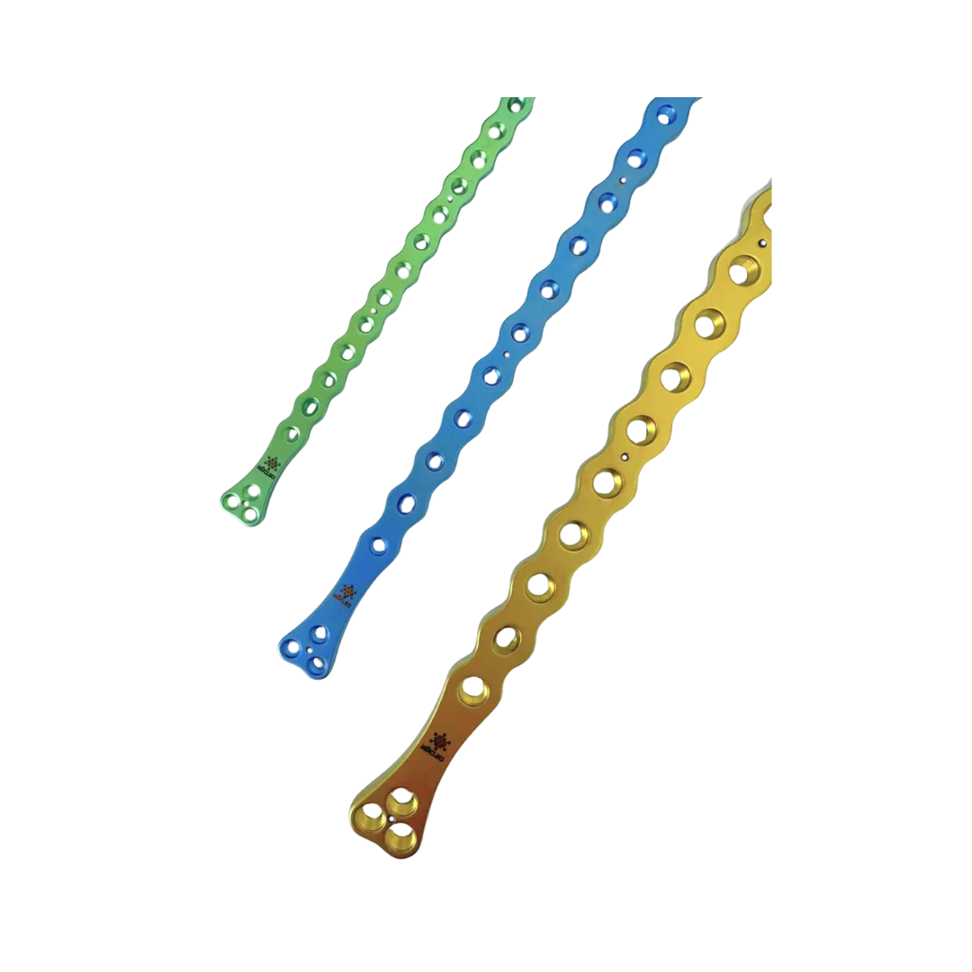 Placa de titanio TC4 anodizado con diseño en doble T para fracturas articulares y metafisarias.