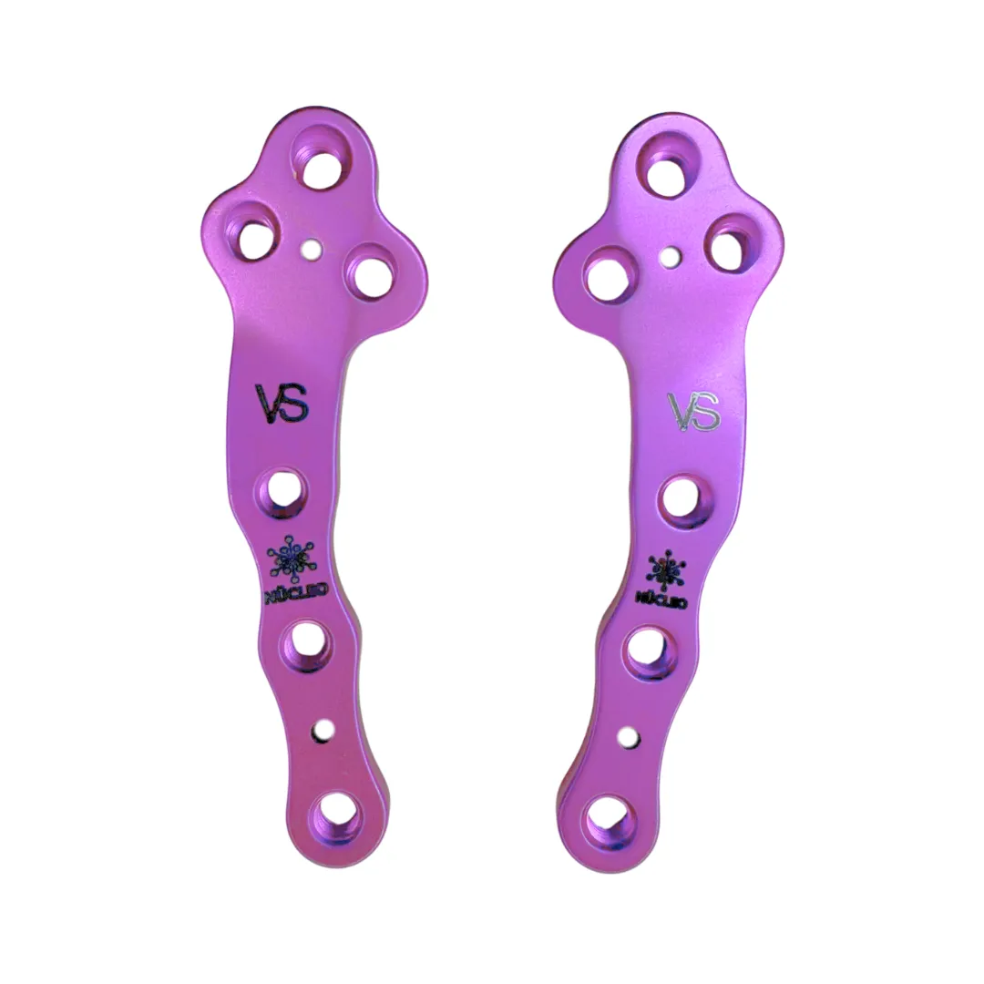 Placa de titanio TC4 anodizado con diseño curvo para técnica TPLO. Configuración 3+3 orificios con bloqueo angular.