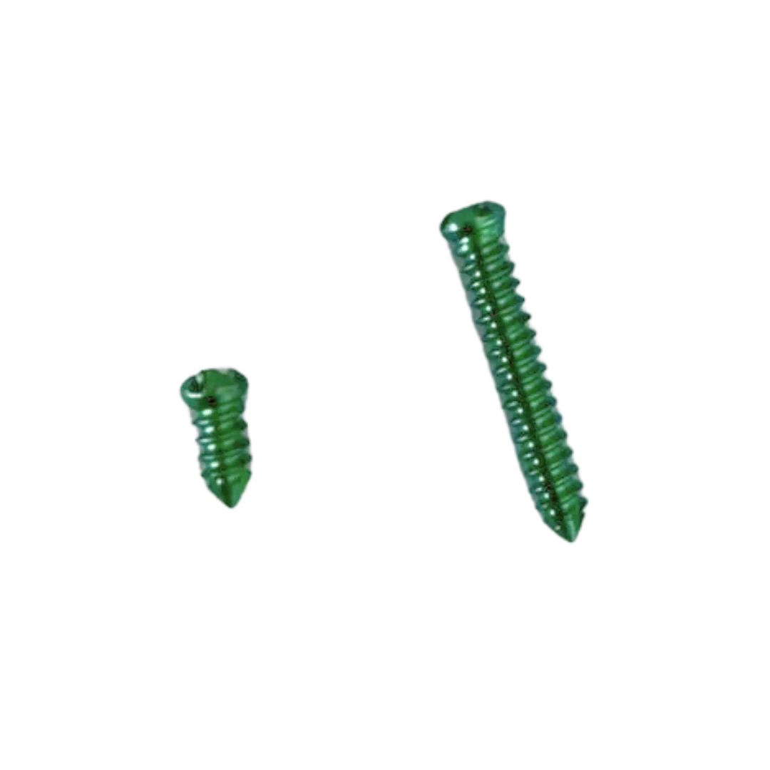 Tornillo de titanio TC4 anodizado con sistema de bloqueo angular diseñado para hueso cortical fino en gatos y perros de raza pequeña.